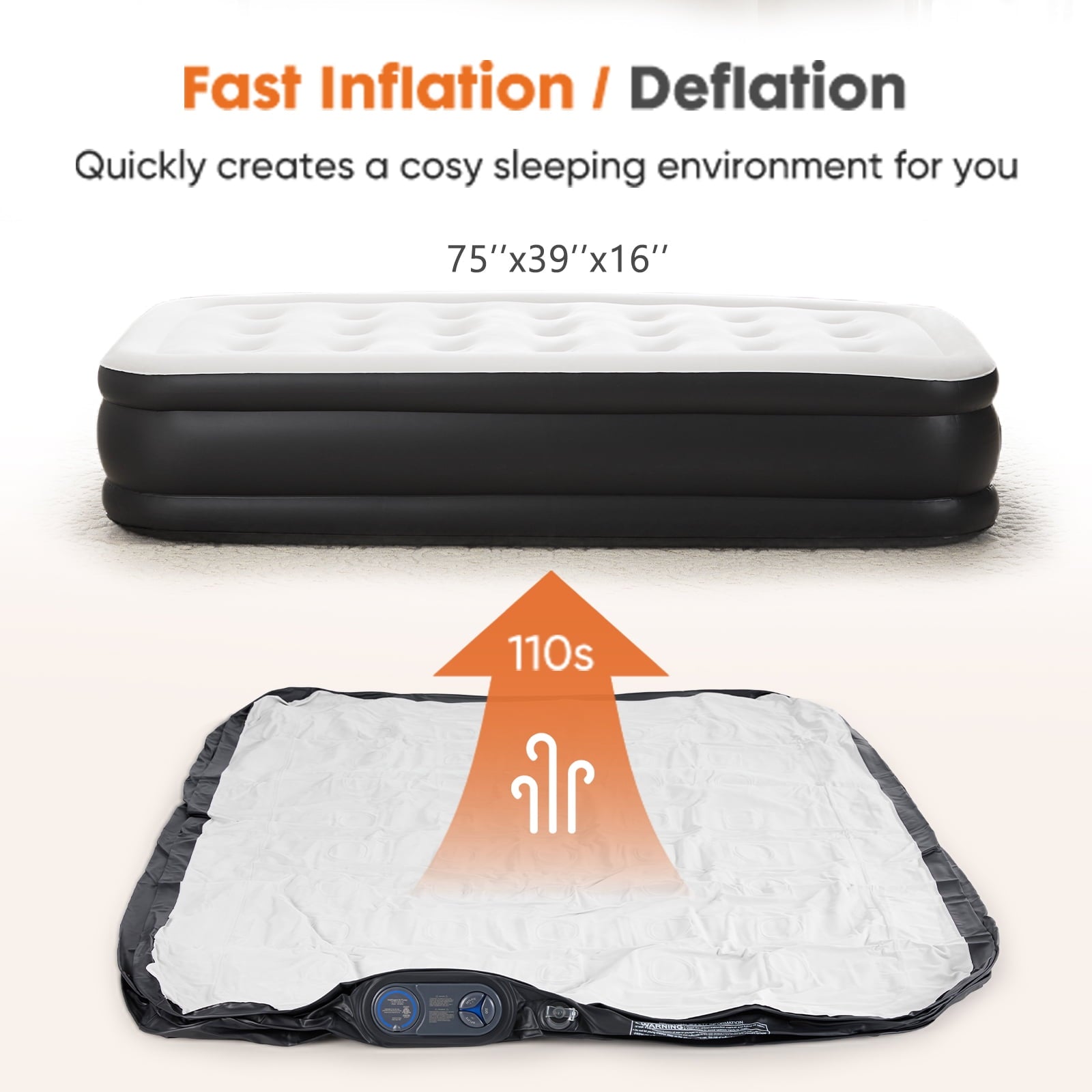 - 【Built-in High-Capacity Pump】Inflates and deflates quickly with the built-in 110V electric air pump. Inflation times: 22" Queen (240s), 18" Queen (200s), 16" Queen (150s), 18" Twin (130s), 16" Twin (110s).