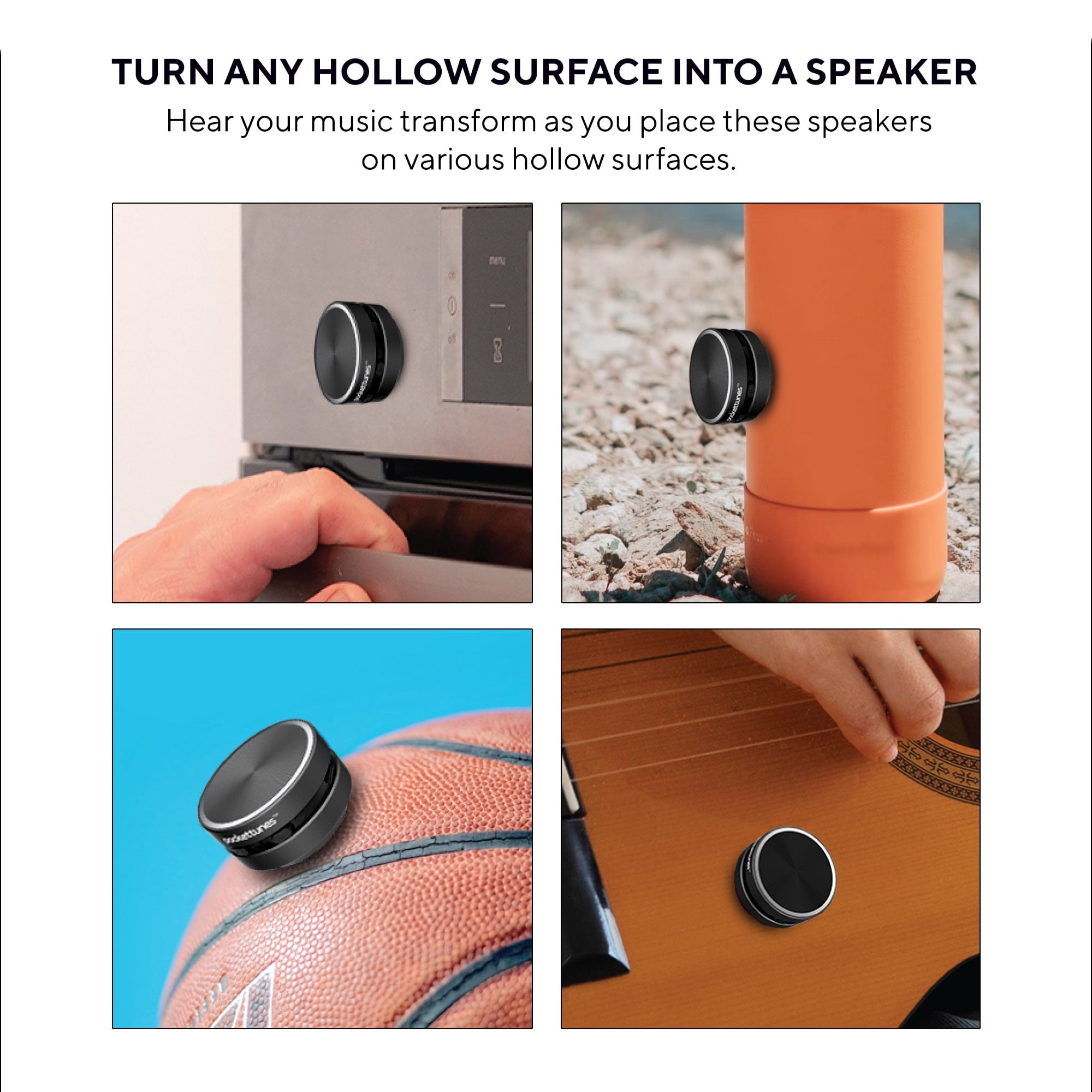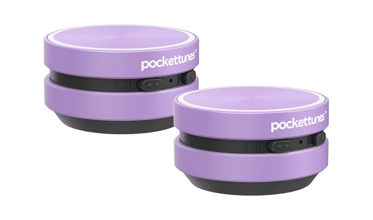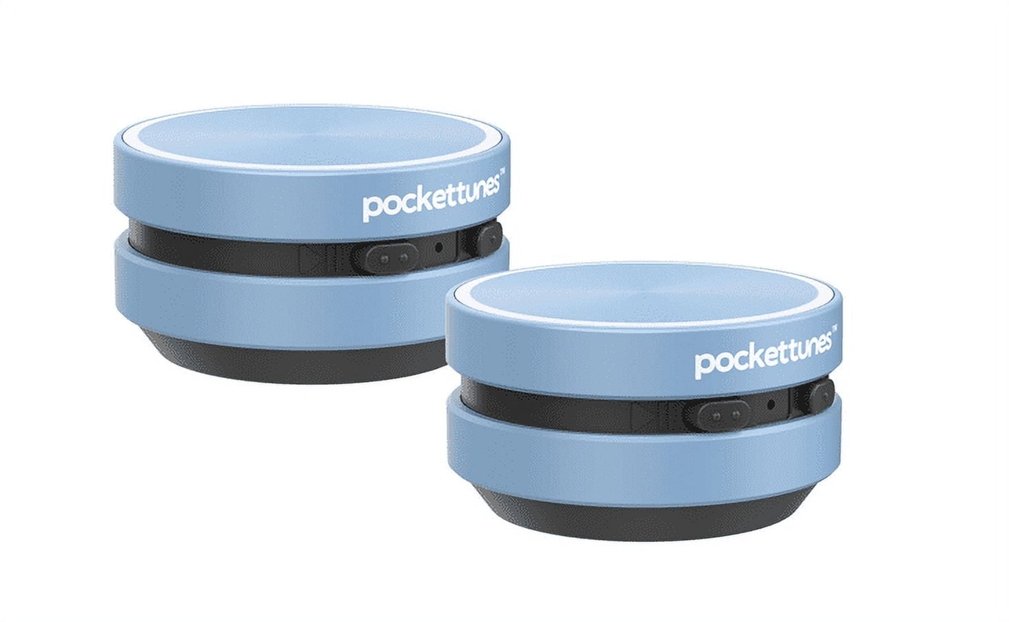 At only 1.57 x 0.95 inches, these small but mighty Bluetooth speakers pack a big punch. Featuring bone conduction technology, the PocketTunes Instant Speakers transform your music when you place them on or in various hollow surfaces. By placing in different types of containers, you have unlimited options for different sound experiences. Use the included suction cups or magic stickers to mount your instant speakers to a multitude of surfaces for a fully customizable audio experience. This pack of two mini Bluetooth speakers delivers clear and powerful sounds that are 4-5 times louder than phones, and pair together seamlessly for a unique stereo sound experience. The built-in rechargeable battery provides up to 6 hours of play time, so you use these little speakers to enhance your next beach day, dinner party, movie night or use them anywhere. Bluetooth technology enables you to stream your favorite music, podcasts, phone conversations, conference calls, play games, or watch movies. Turn any hollow item (like a box, bucket, or anything with a void) into your own personal, customizable sound system! The PocketTunes speakers are also the ultimate in portability. Use the included lanyards to conveniently carry your PocketTunes Instant Speakers with you wherever you go!