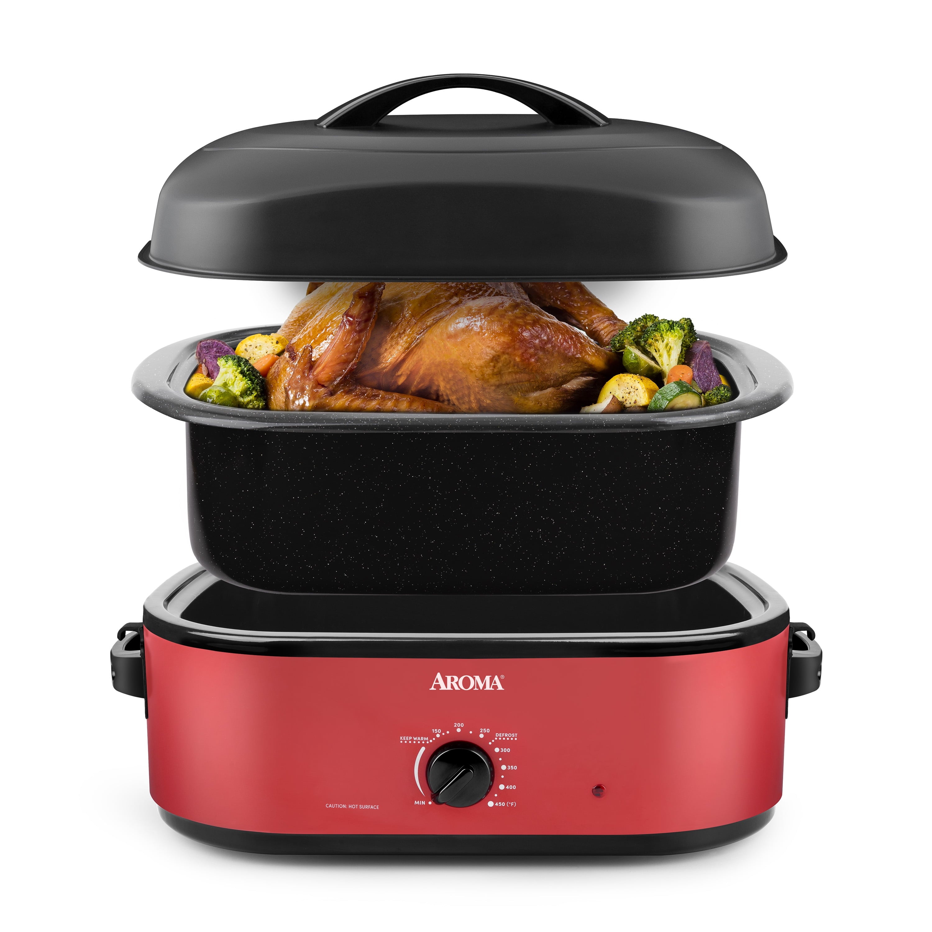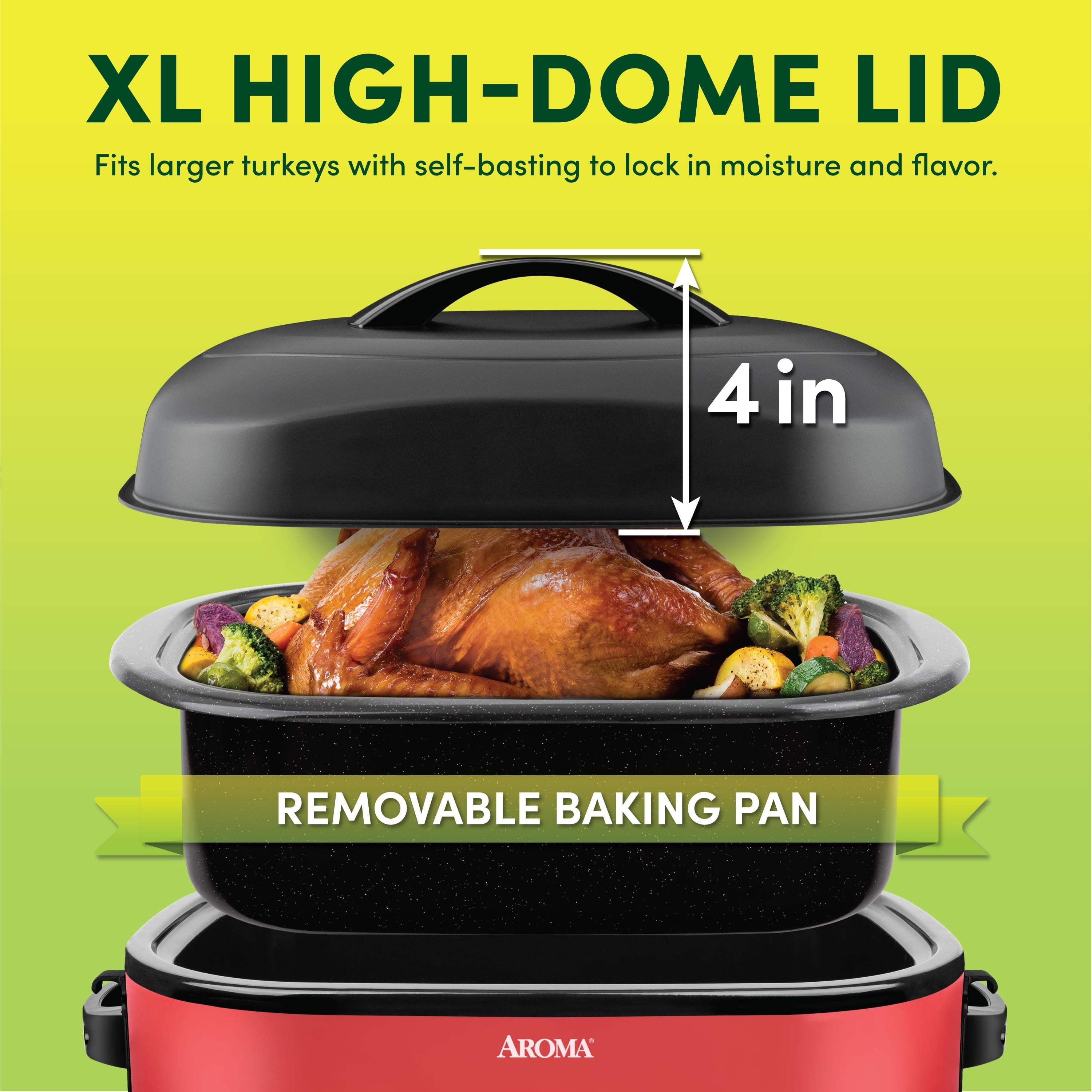 Roast a 24-pound turkey or whole ham in the Aroma® Electric Roaster Oven. The new, domed lid provides better heat circulation and traps steam for moist, tender meat without basting. The 18-quart electric roaster pan features the durable 8X Bonded Granite® Enamel Pan for superior cooking performance and easy cleaning. The stainless steel rack allows for effortless lifting and serving. Electric roaster ovens cook more efficiently, so you can ‘slow’ roast faster. Adjust the temperature from 150° to 450°F, with settings for defrost and keep warm.