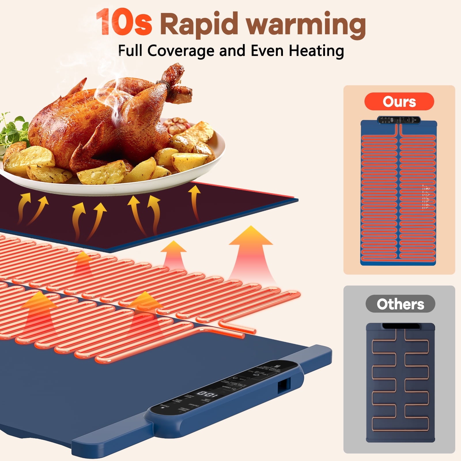 - 【10S Rapid Full-Surface Heating】Electric Warming Tray Experience rapid and uniform warming across a large heating area. Our thoughtfully designed heating wire ensures quick and even distribution, allowing you to arrange your tableware freely.