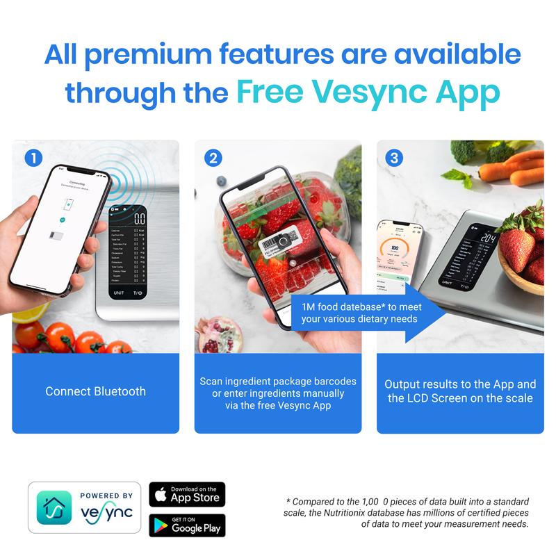 Etekcity smart nutrition scale is supported by a robust food database with approximately 1 million items, giving you access to detailed nutritional information anytime. What makes it truly powerful is the FREE AI Scan feature β simply scan your food with your phone, and the app instantly recognizes and logs the item for you.