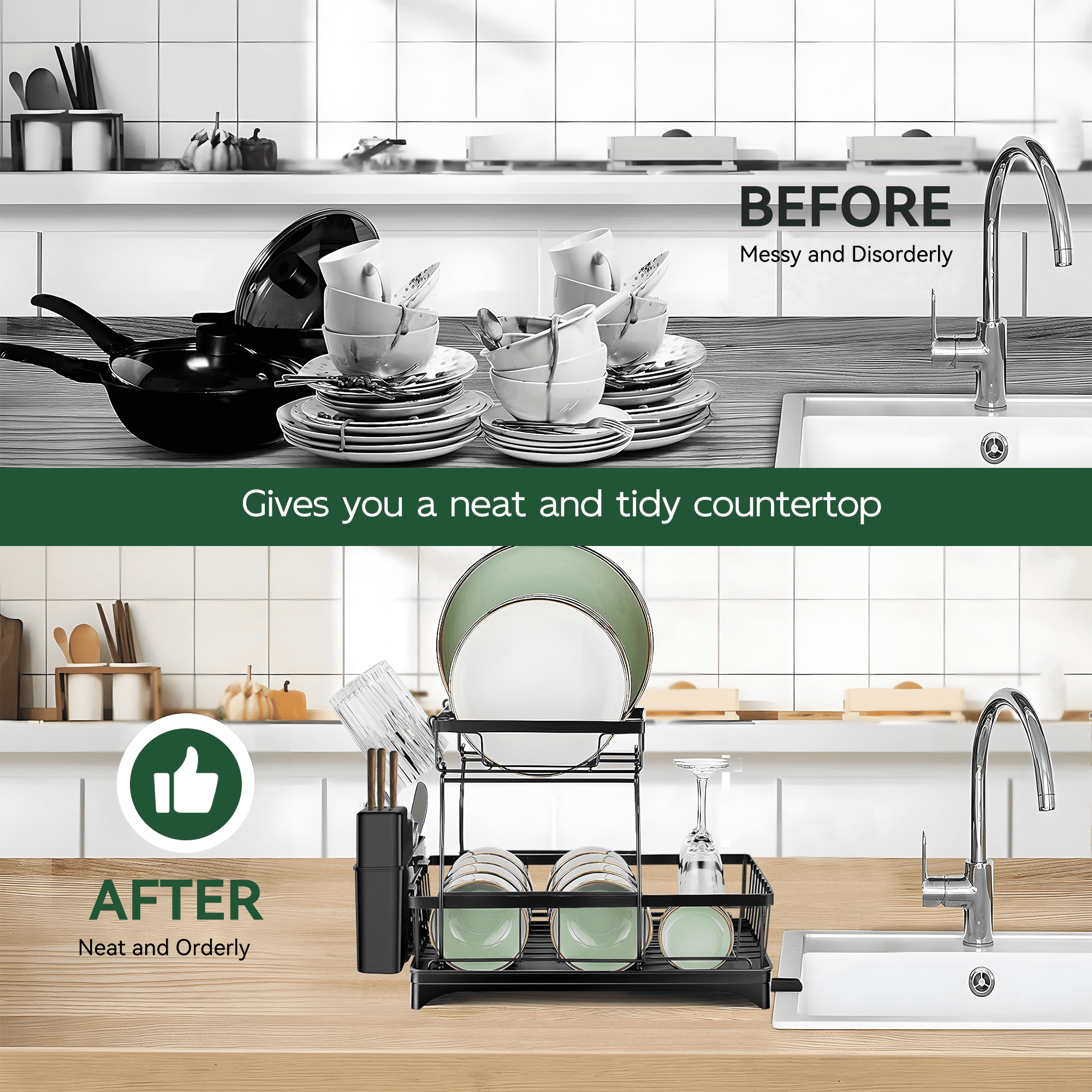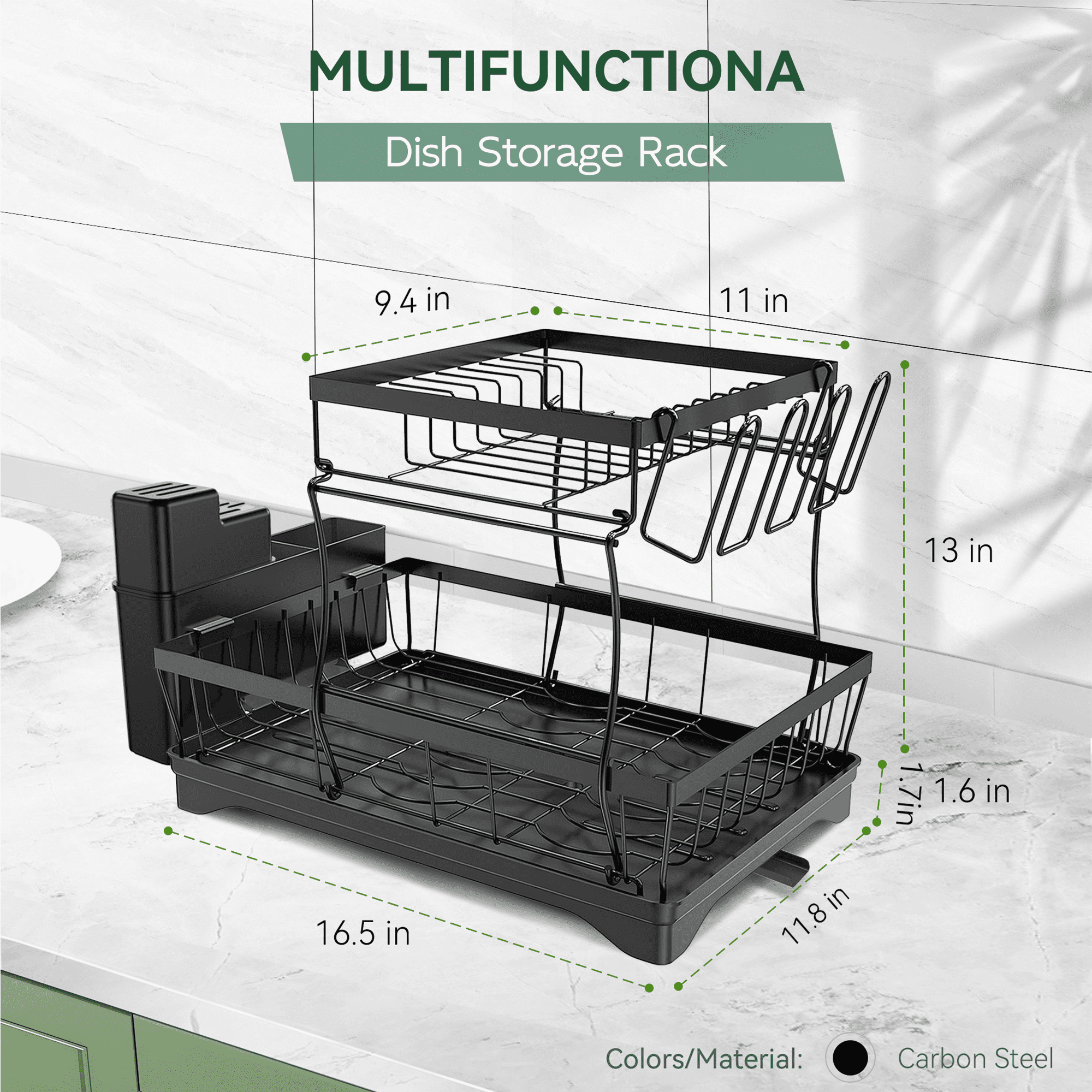 Multifunction- 4 in 1 Storage, Cost-effective. A compact kitchen drying rack, you'll get a utensil holder, cup holder, dishes & utensil rack, water tray.