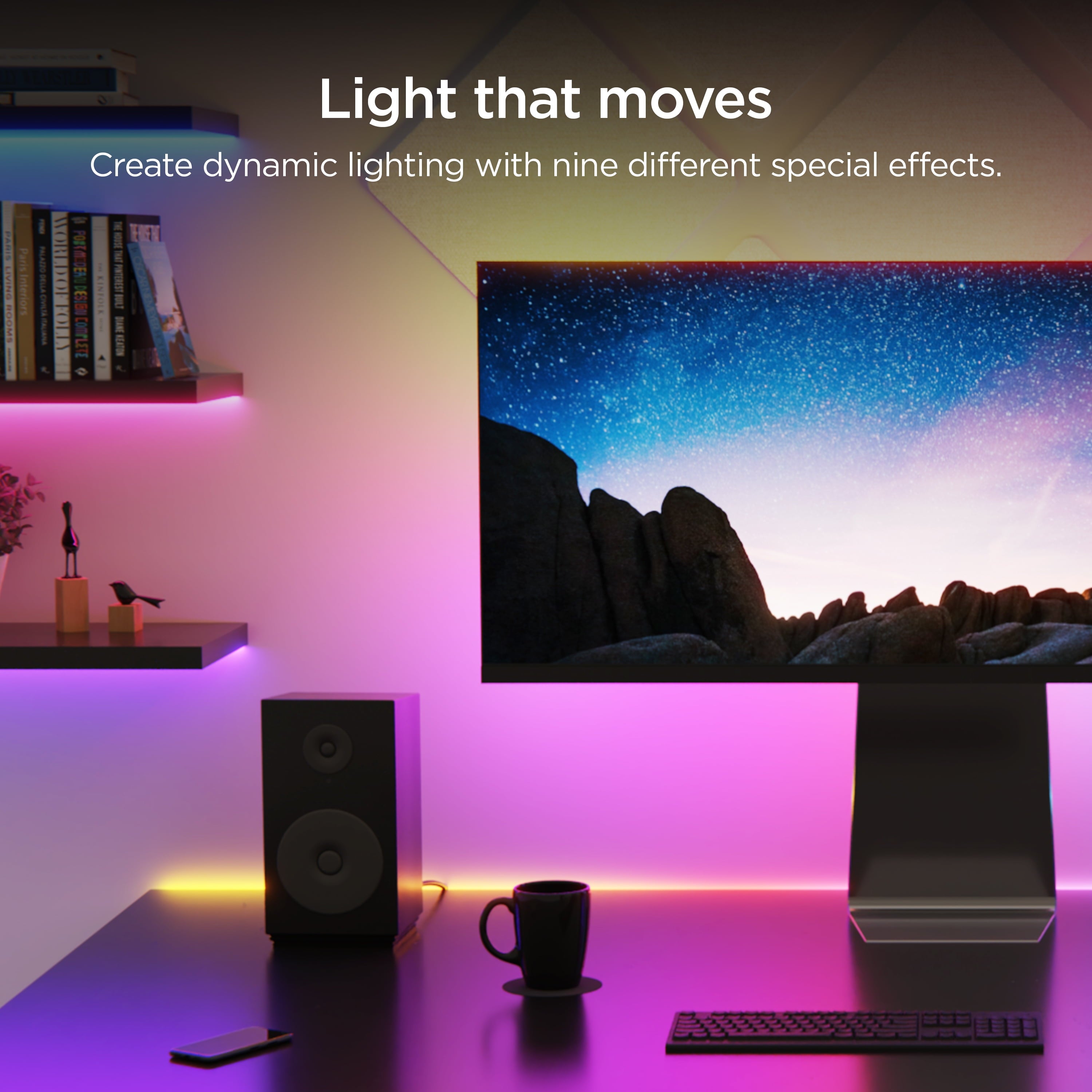 - Light that moves: It’s not just lights on or lights off. Create dynamic lighting that pulses, flickers, cascades, and more with nine different special effects.
